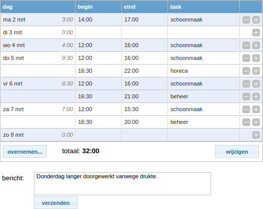 Gewerkte uren die al bekend zijn uit het rooster worden automatisch ingeladen en de medewerker past waar nodig de tijden aan. Eventueel kan er een bericht meegestuurd worden.